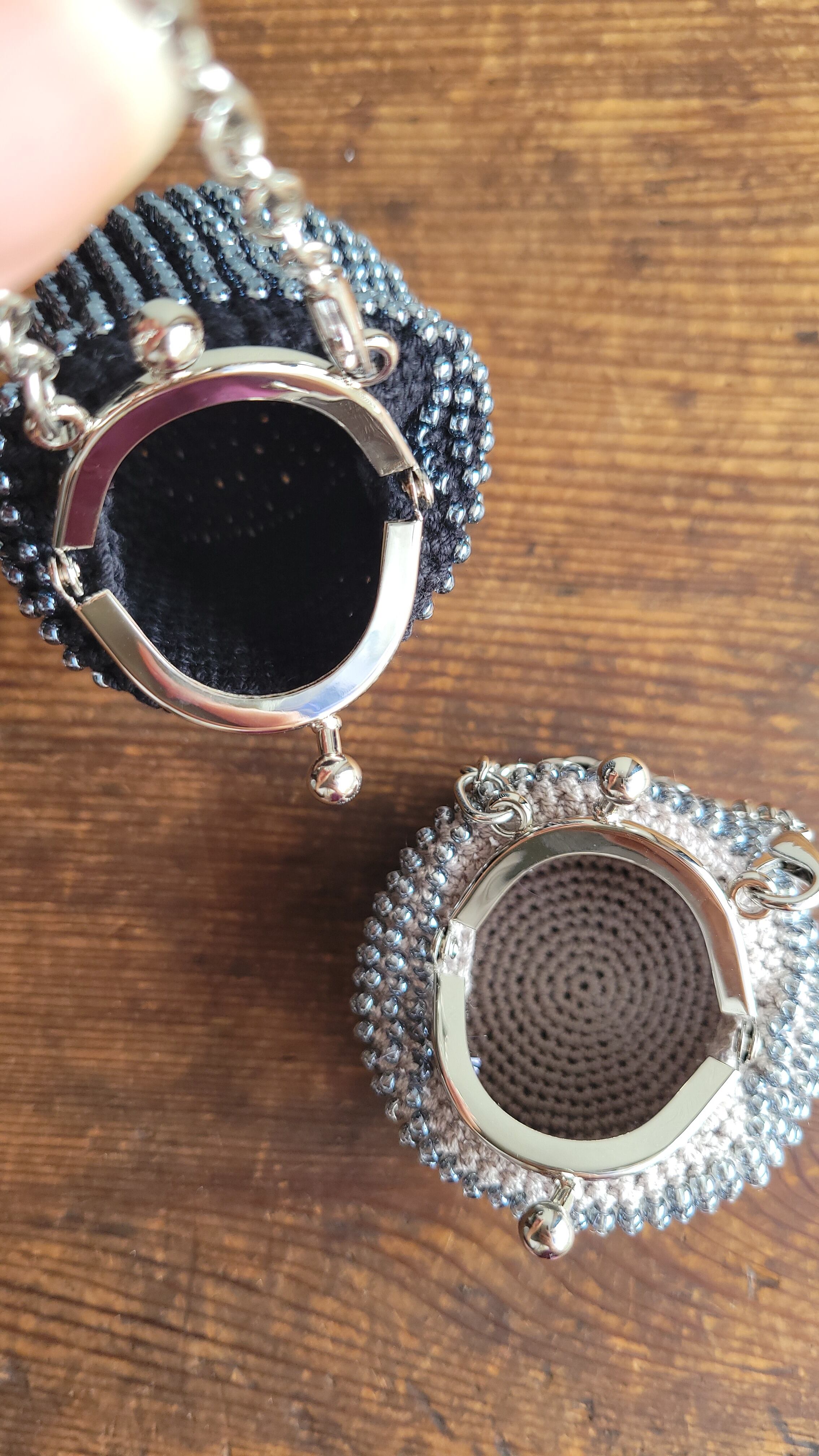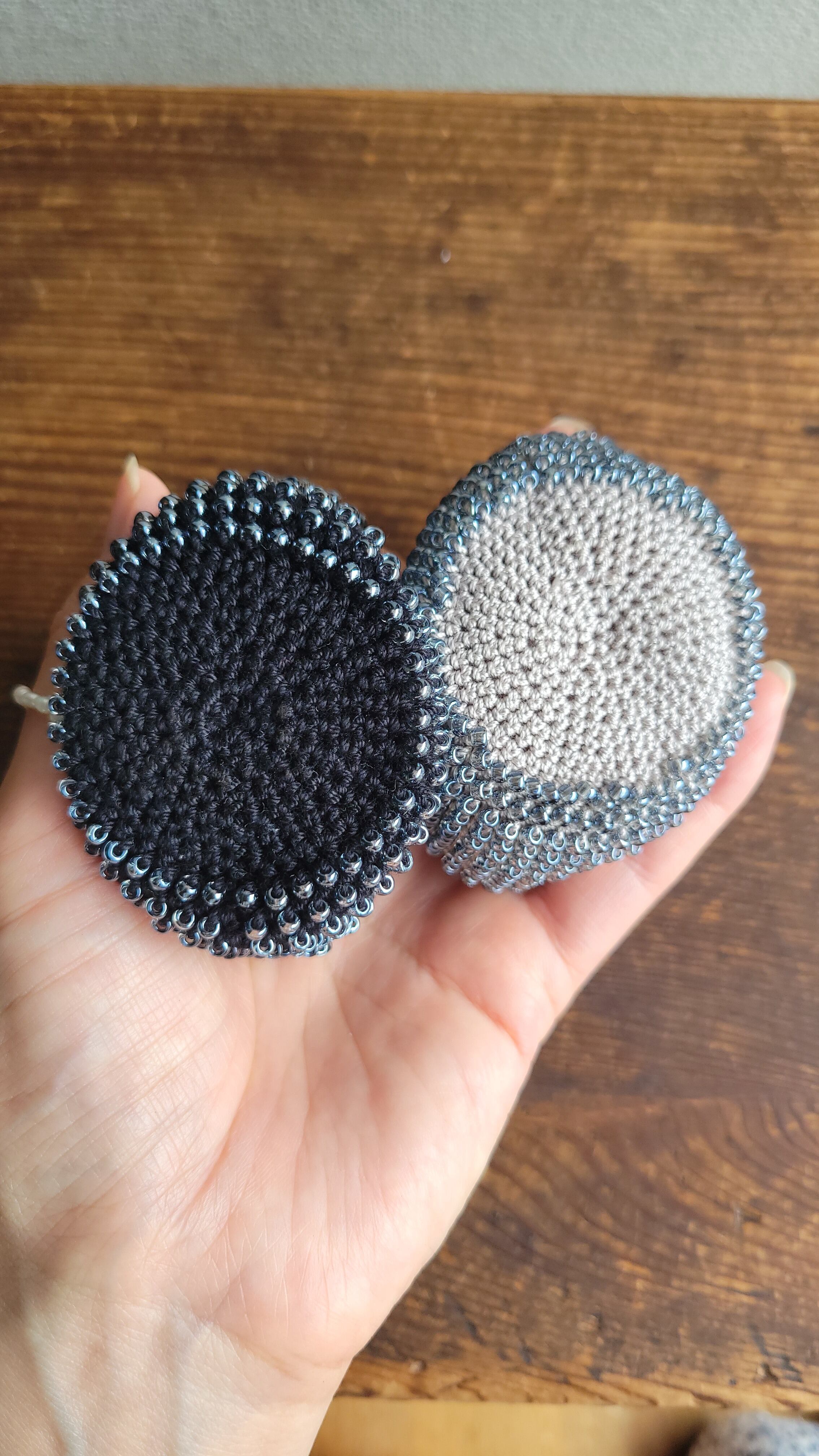 淡いグレーのビーズと黒糸で編んだ