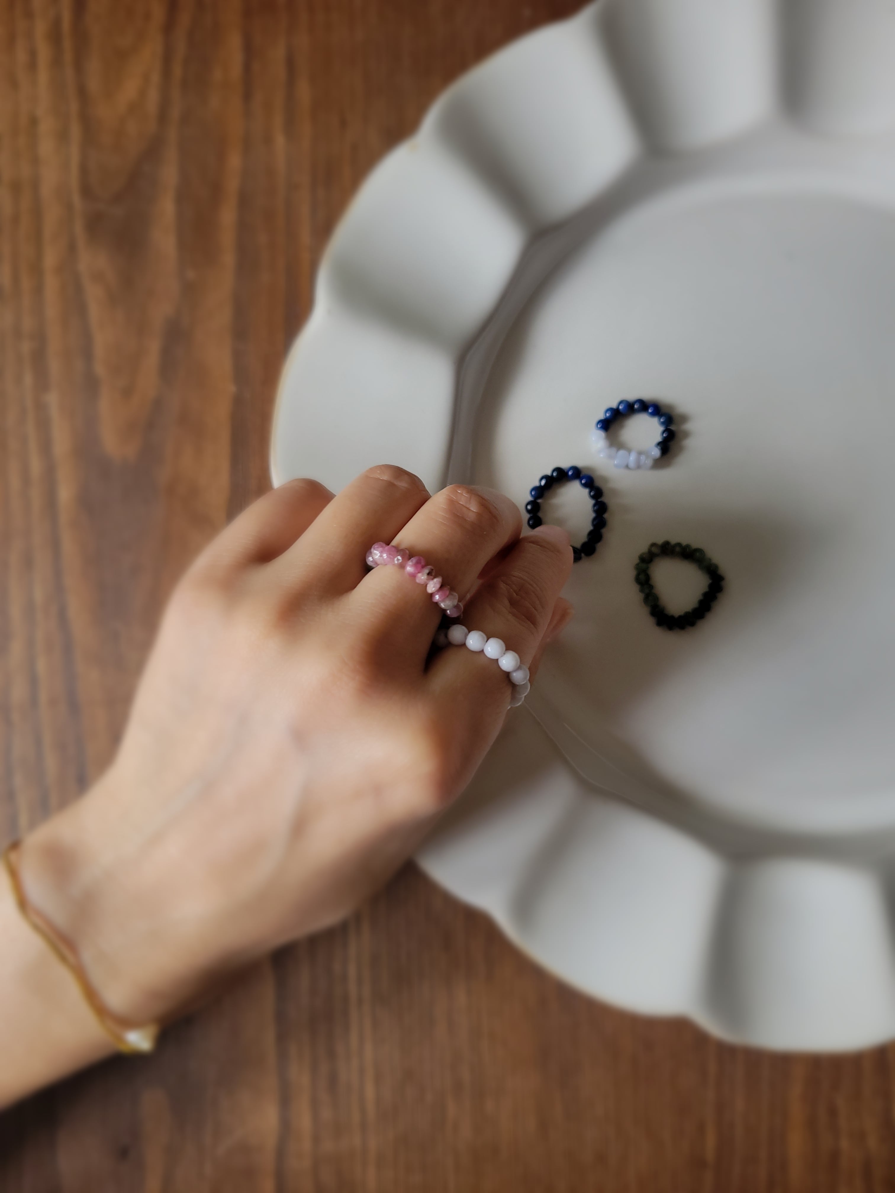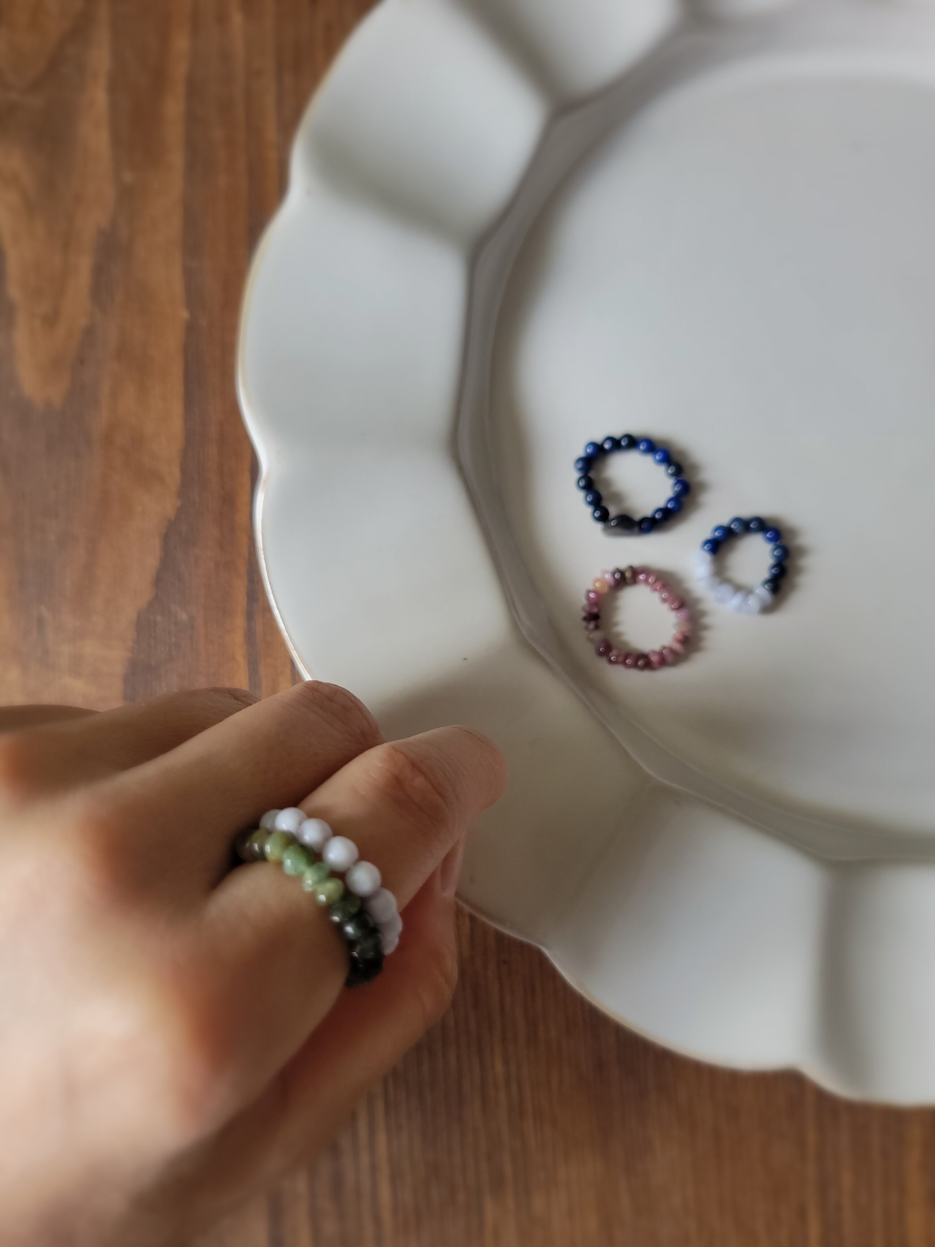 ビーズやシェル、石を繋いだリング「カサネ」も