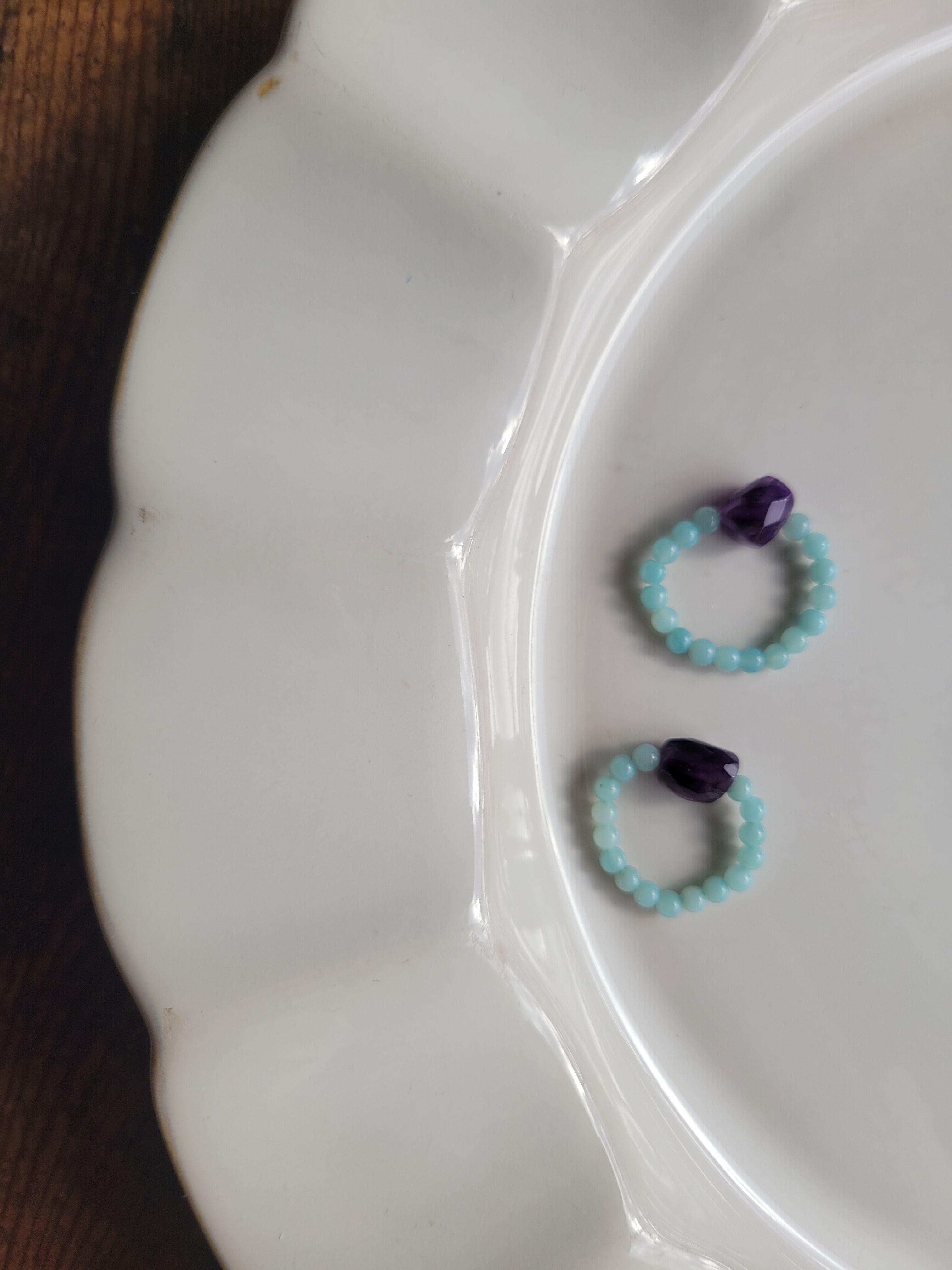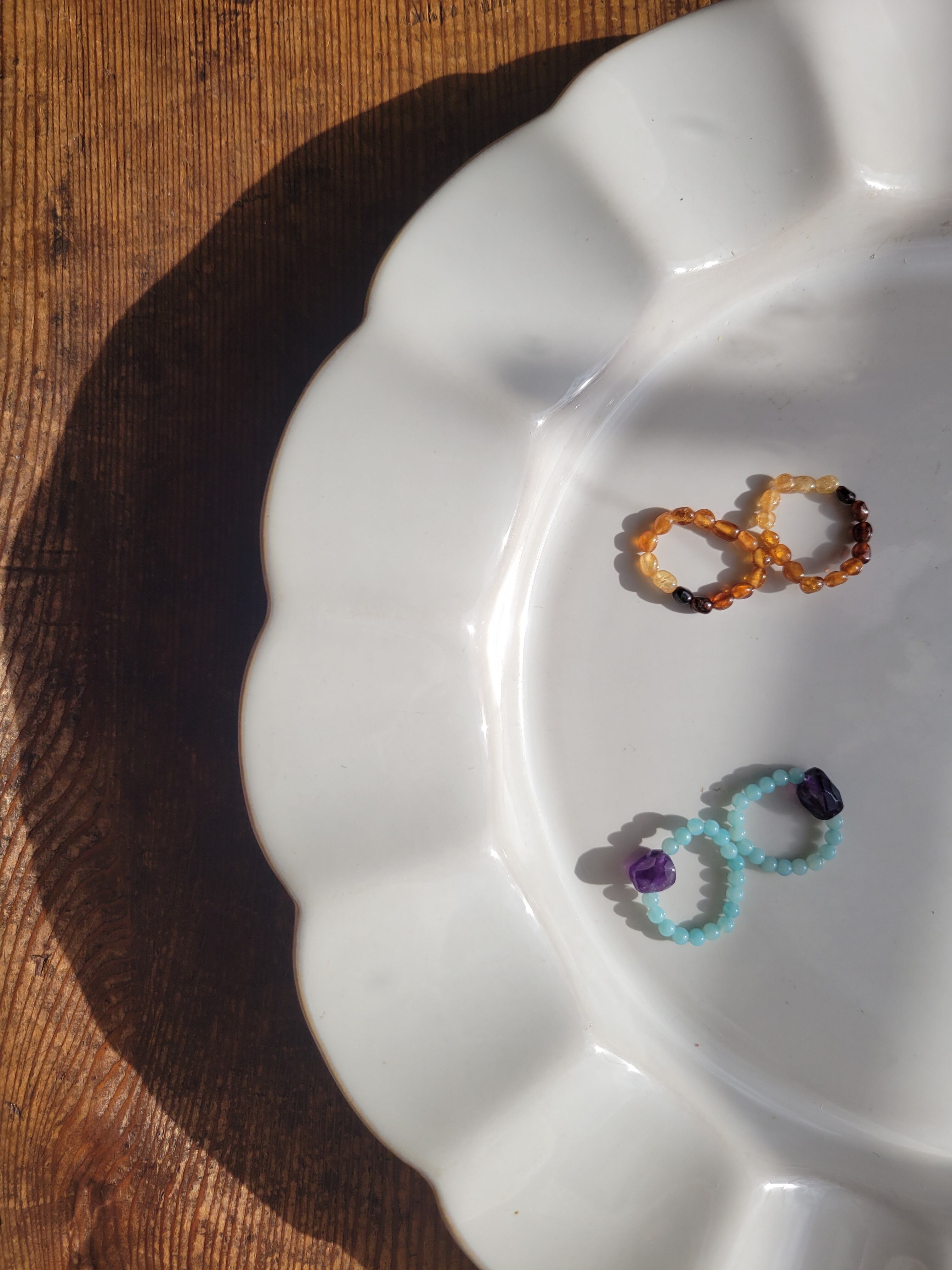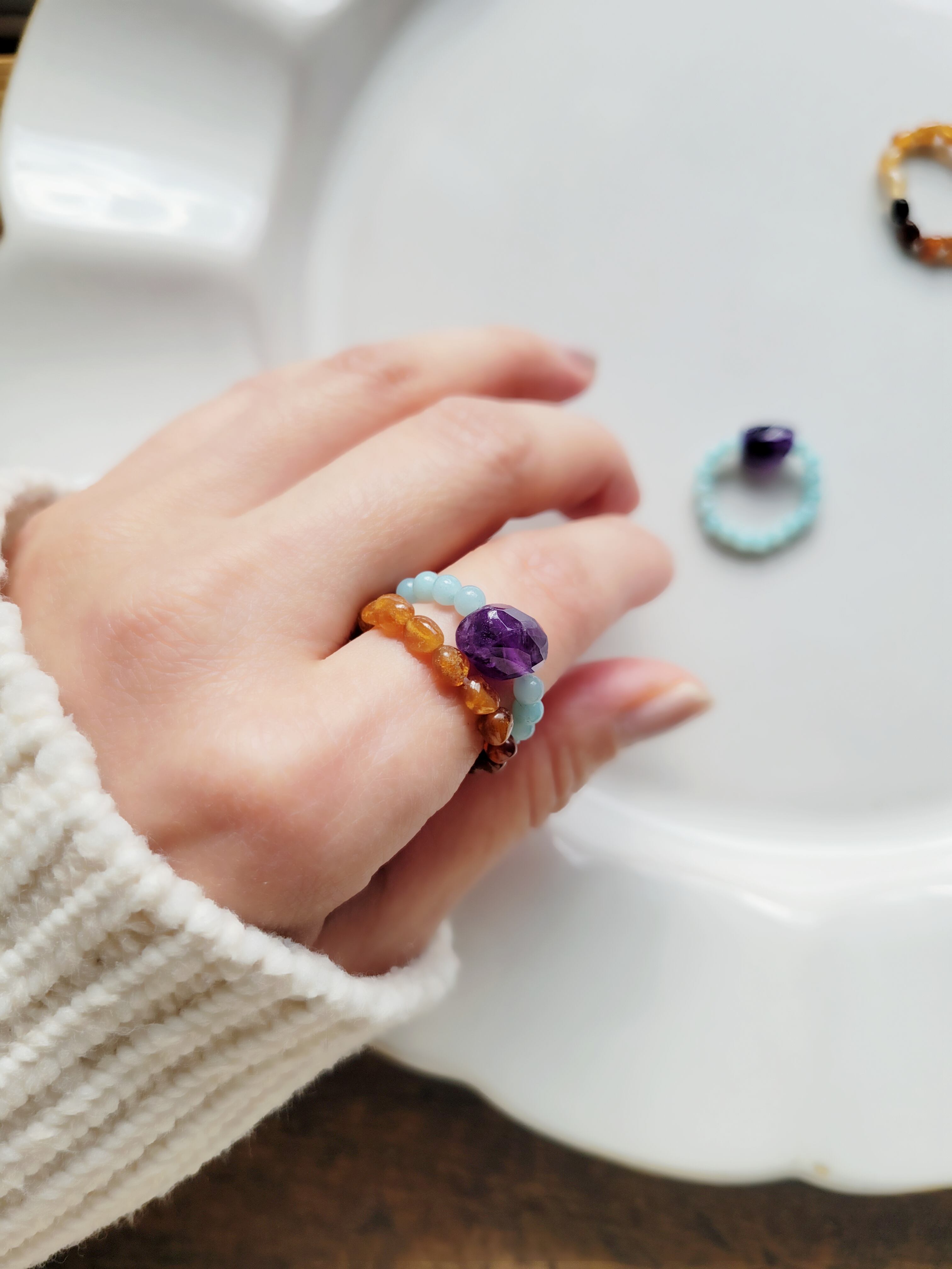 ビーズやシェル、石を繋いだリング「カサネ」もご用意しています。