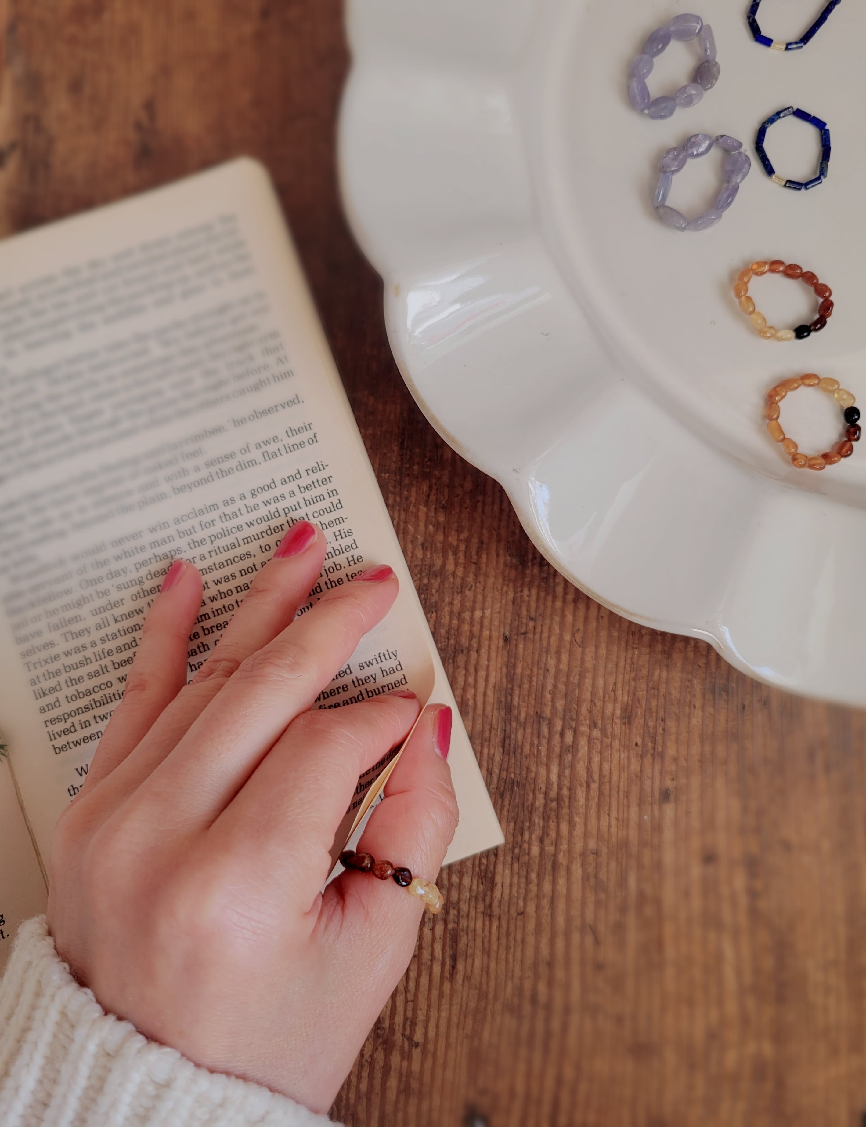 はちみつのような赤褐色の温かみのある色合いが特徴のヘソナイトガーネットをグラデーションで繋いだリング。