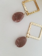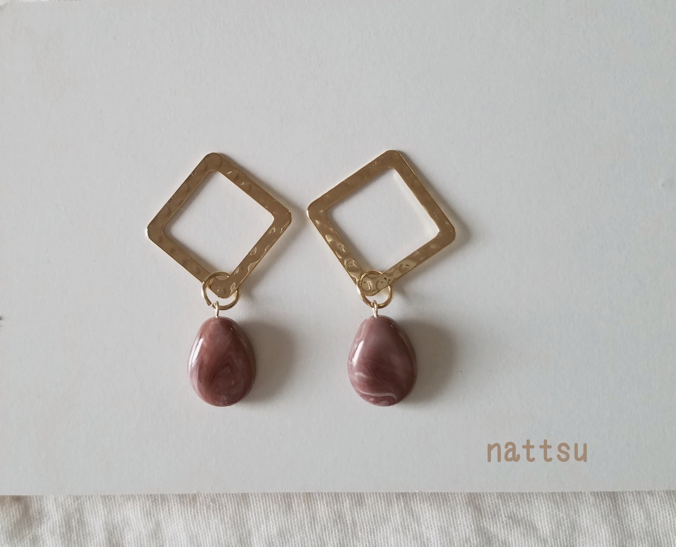 大きな四角いモチーフから下がるヌーディーカラーが大人っぽいイヤリング。