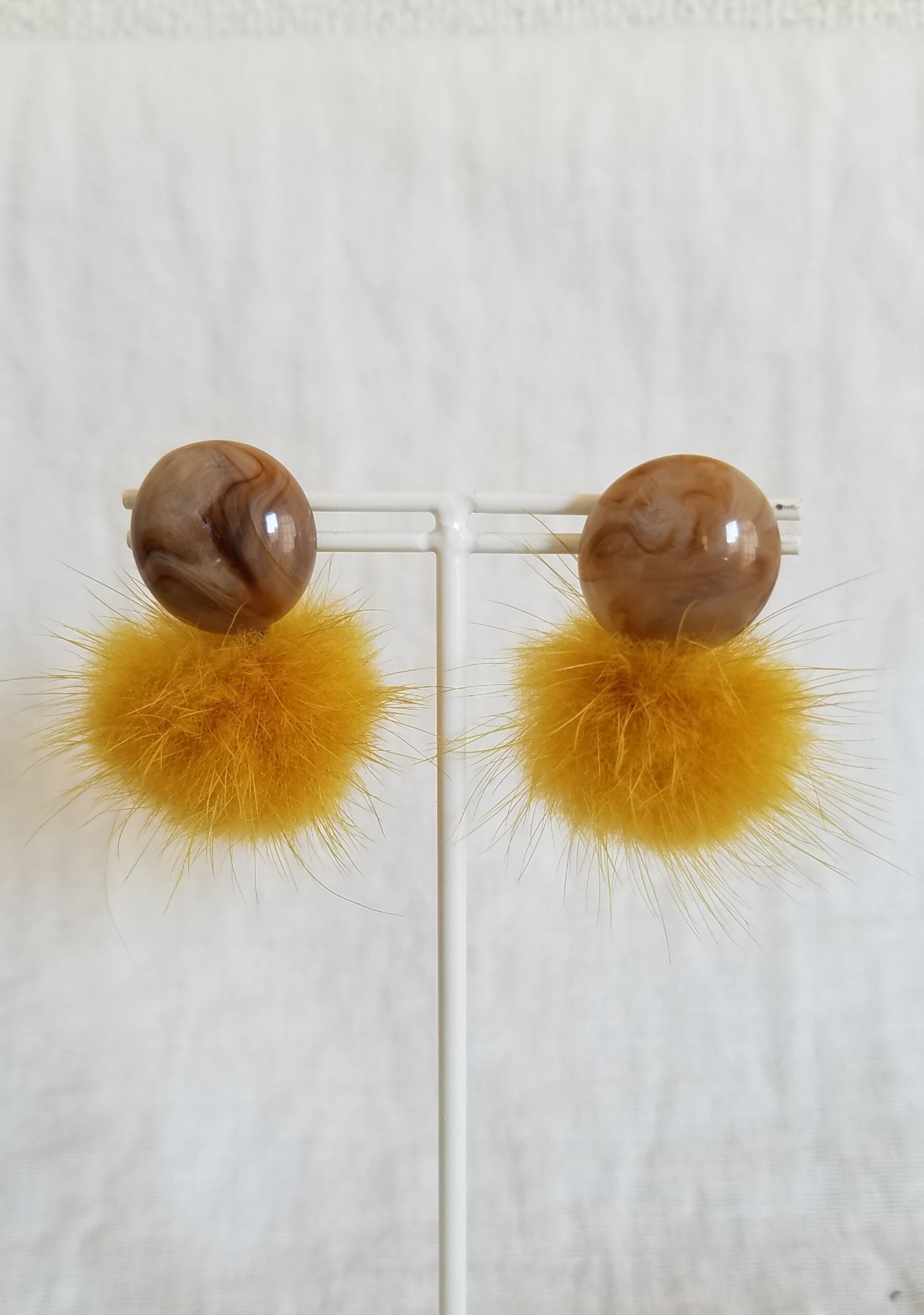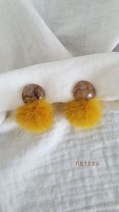 耳のすぐ下で小さく揺れるファーがかわいいネジバネ式のイヤリングです。
