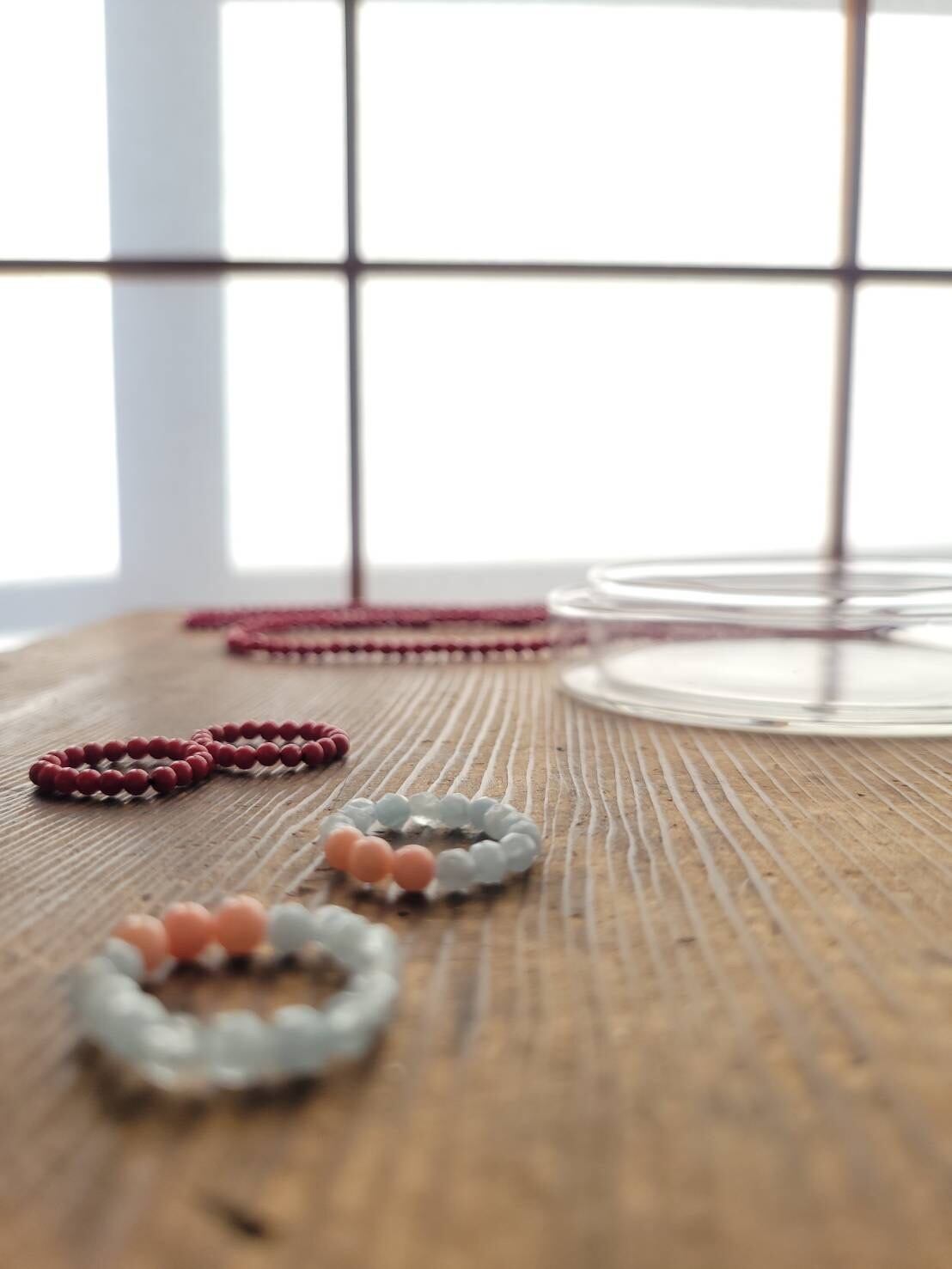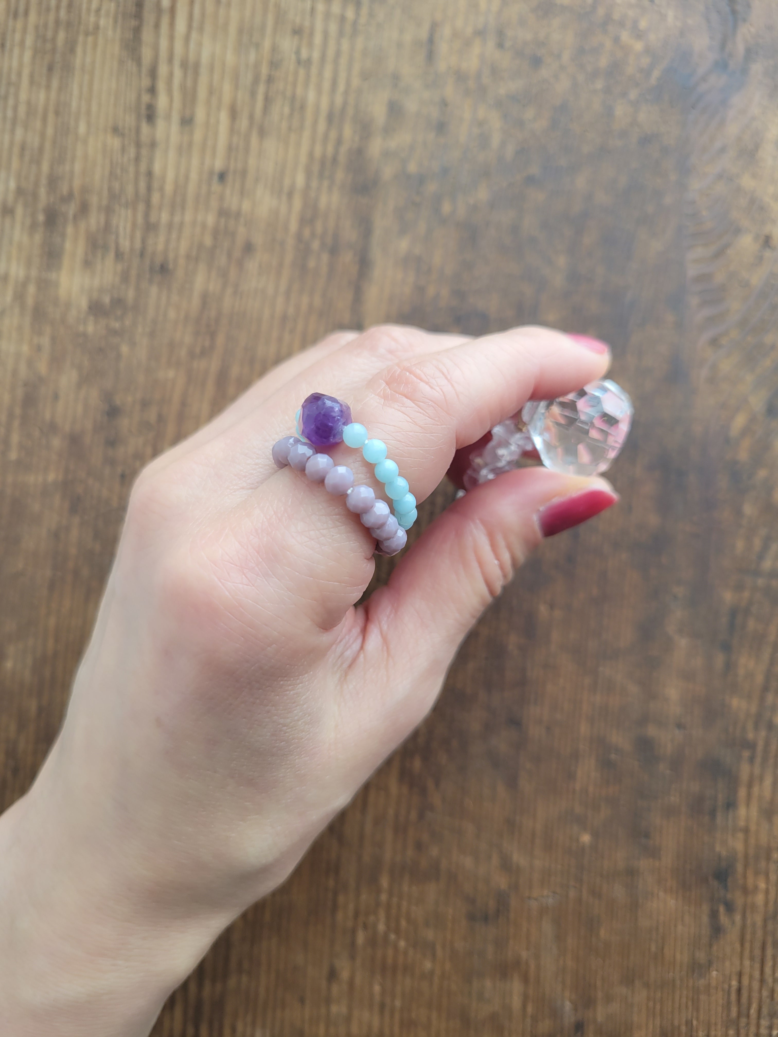 ビーズやシェル、石を繋いだリング「カサネ」もご用意しています。