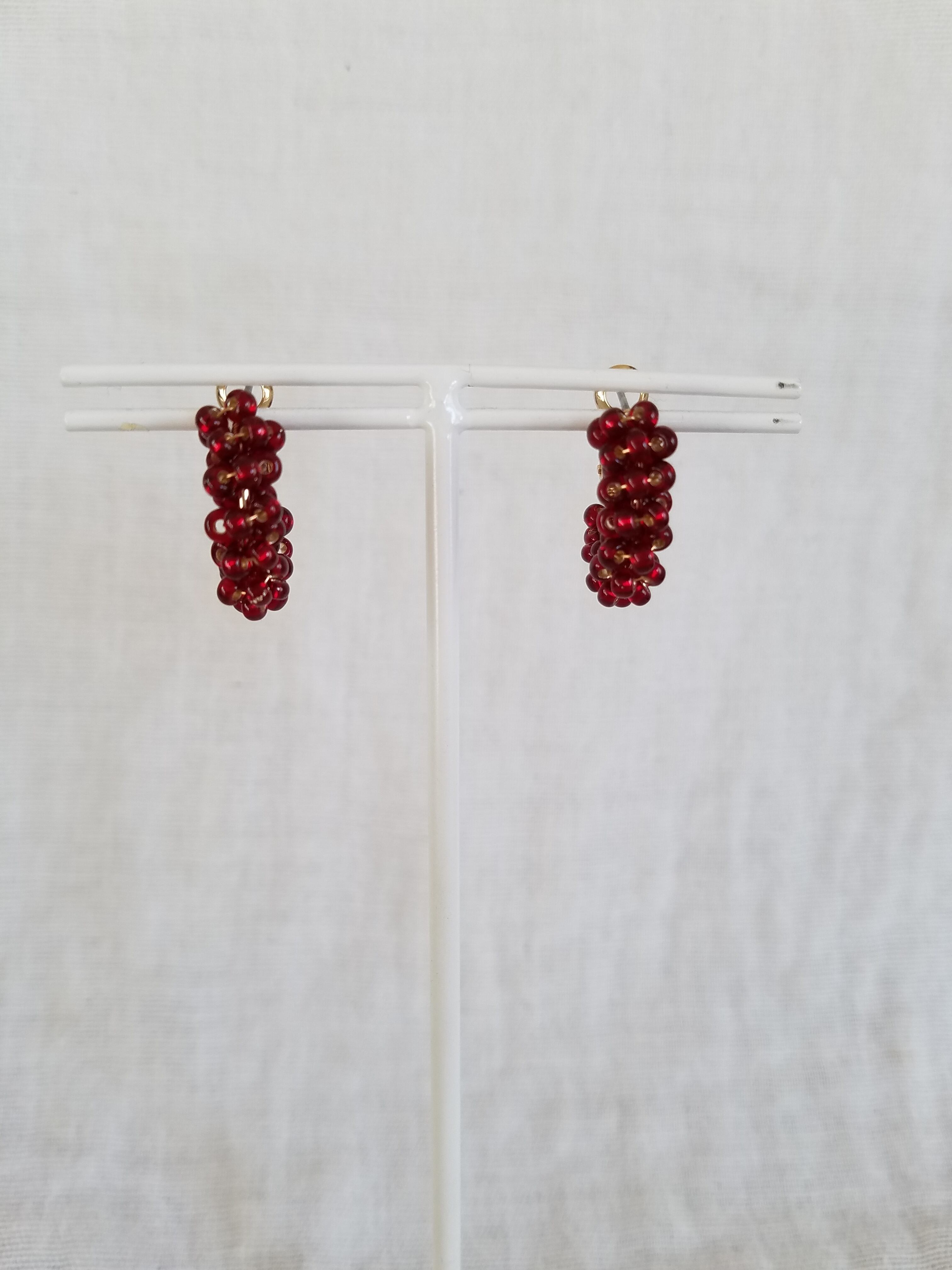 レッドは明るすぎない深みのある色合いのビーズとゴールドカラーの組み合わせが大人かわいいピアスです。