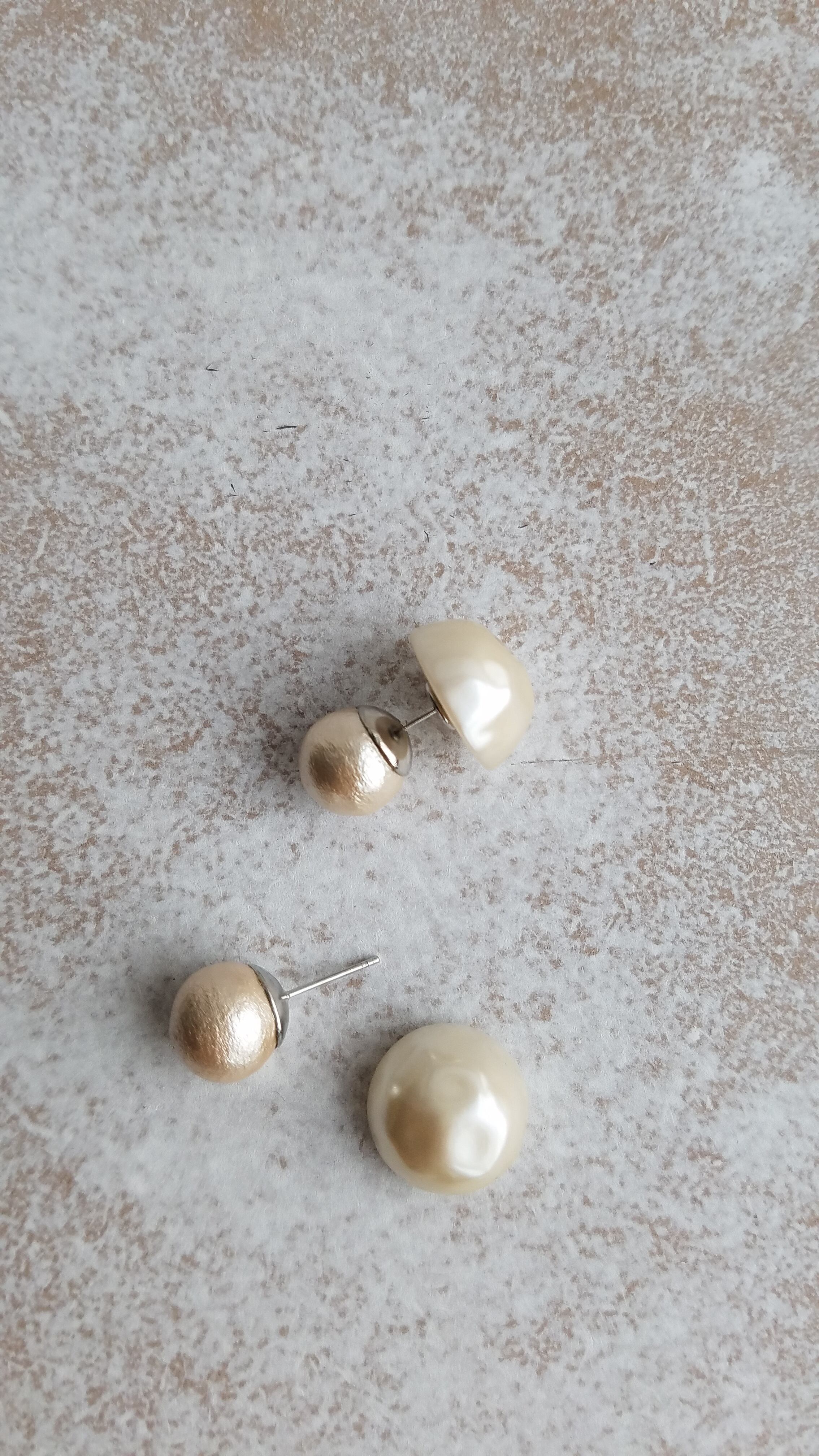 いびつなパールのキャッチと一粒コットンパールのピアスです。
