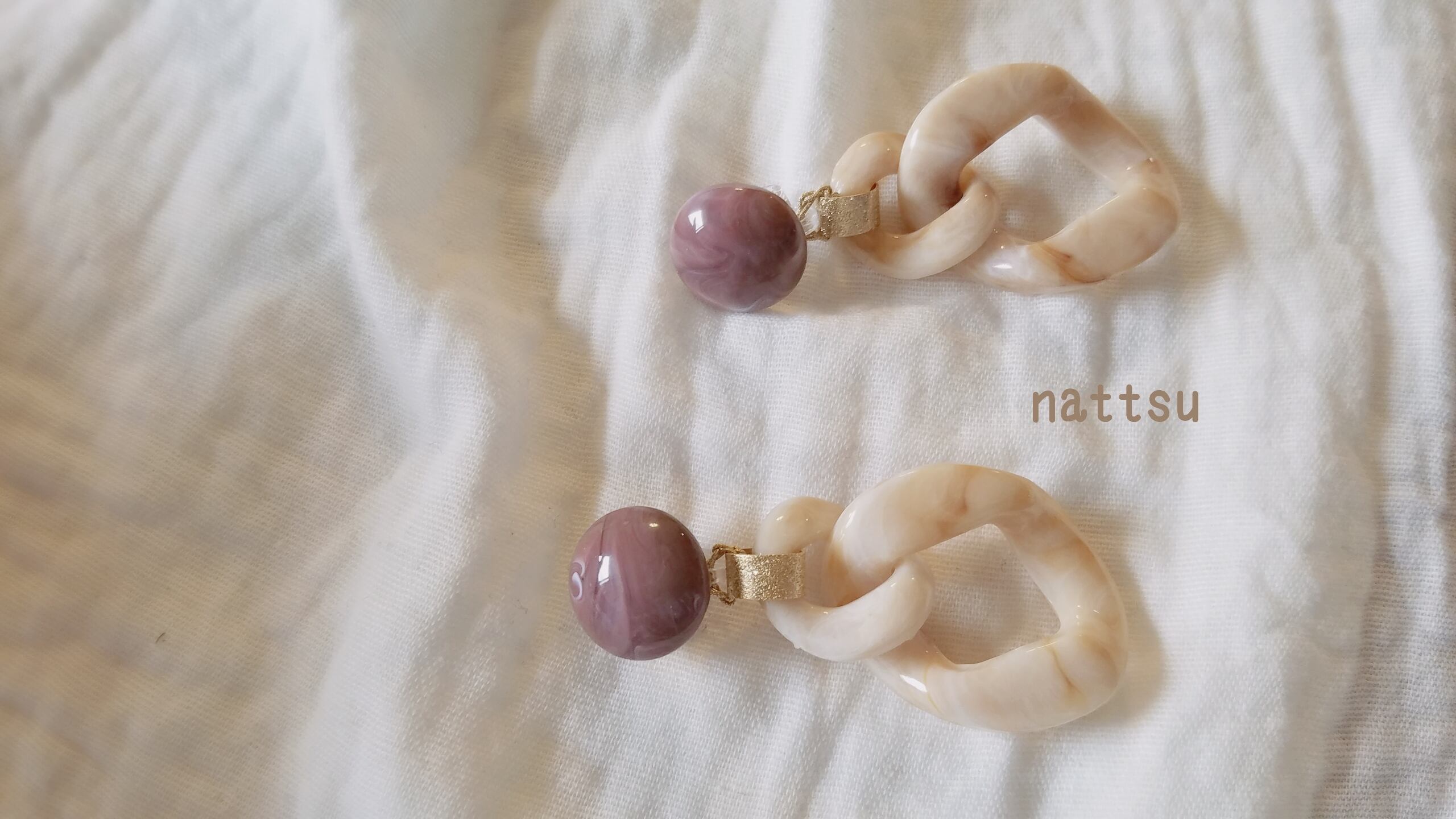 くすんだ色味のローズピンクにベージュチェーンが揺れる大振りの耳飾り。