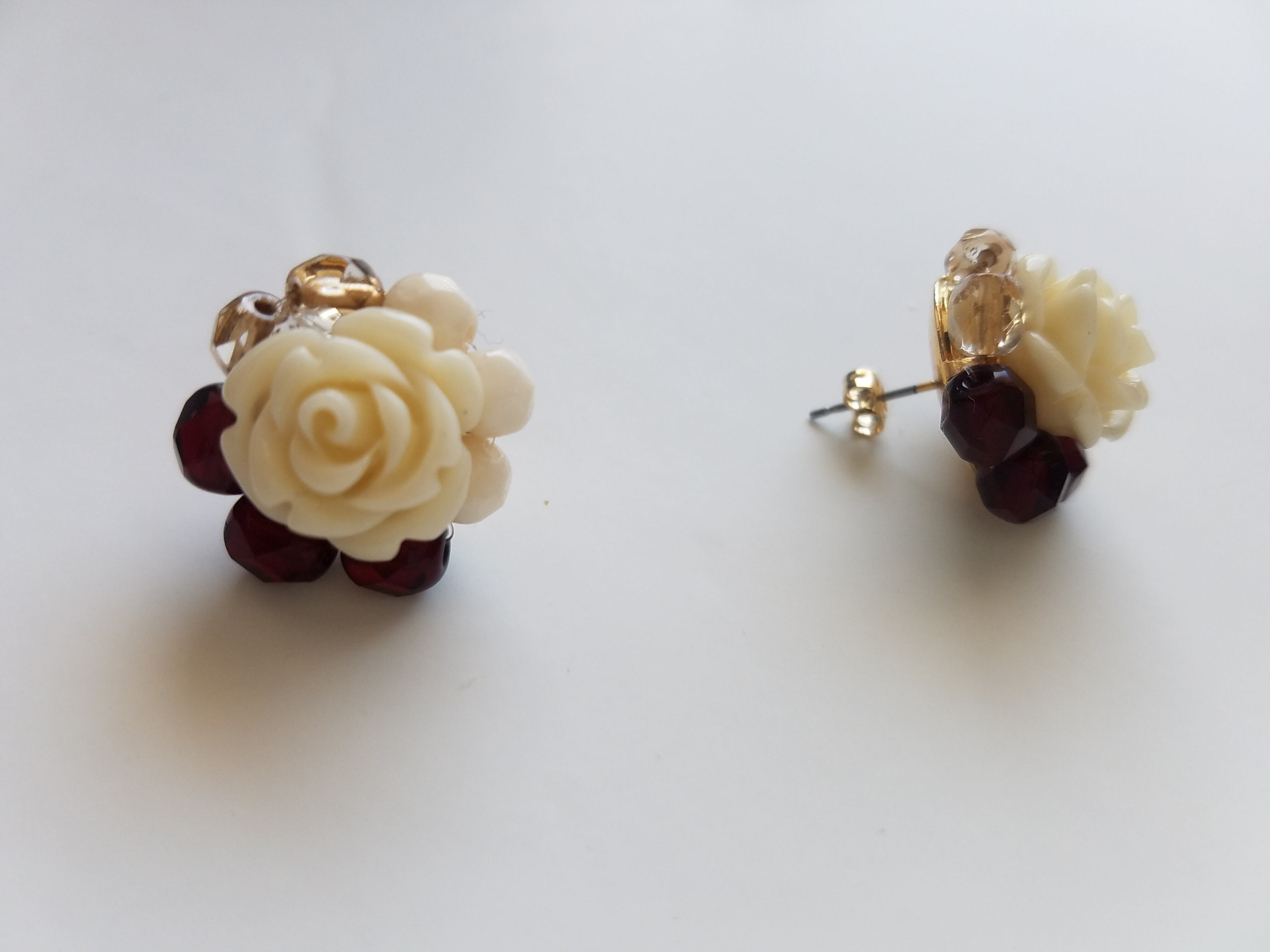 オフホワイトのバラを透明感あるガーネットカラーのチェコビーズがパリッと引き締めてくれています。