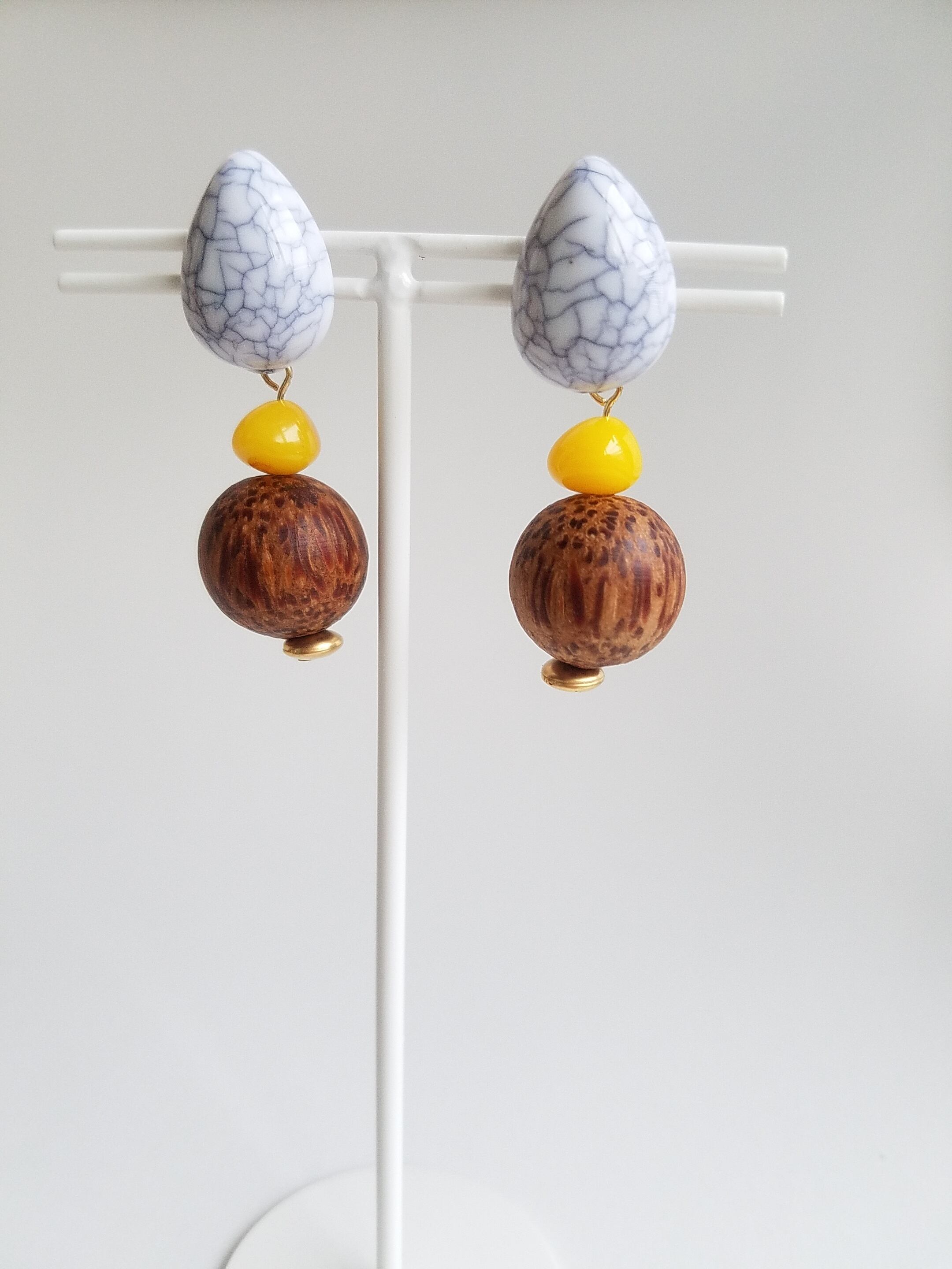 ホワイトグレーのしずく型カボションとウッドボールの大振りイヤリングです。