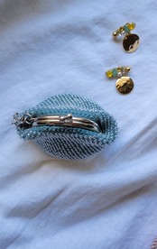 ビーズがま口ポーチ リネン&コットン ツイードブルー