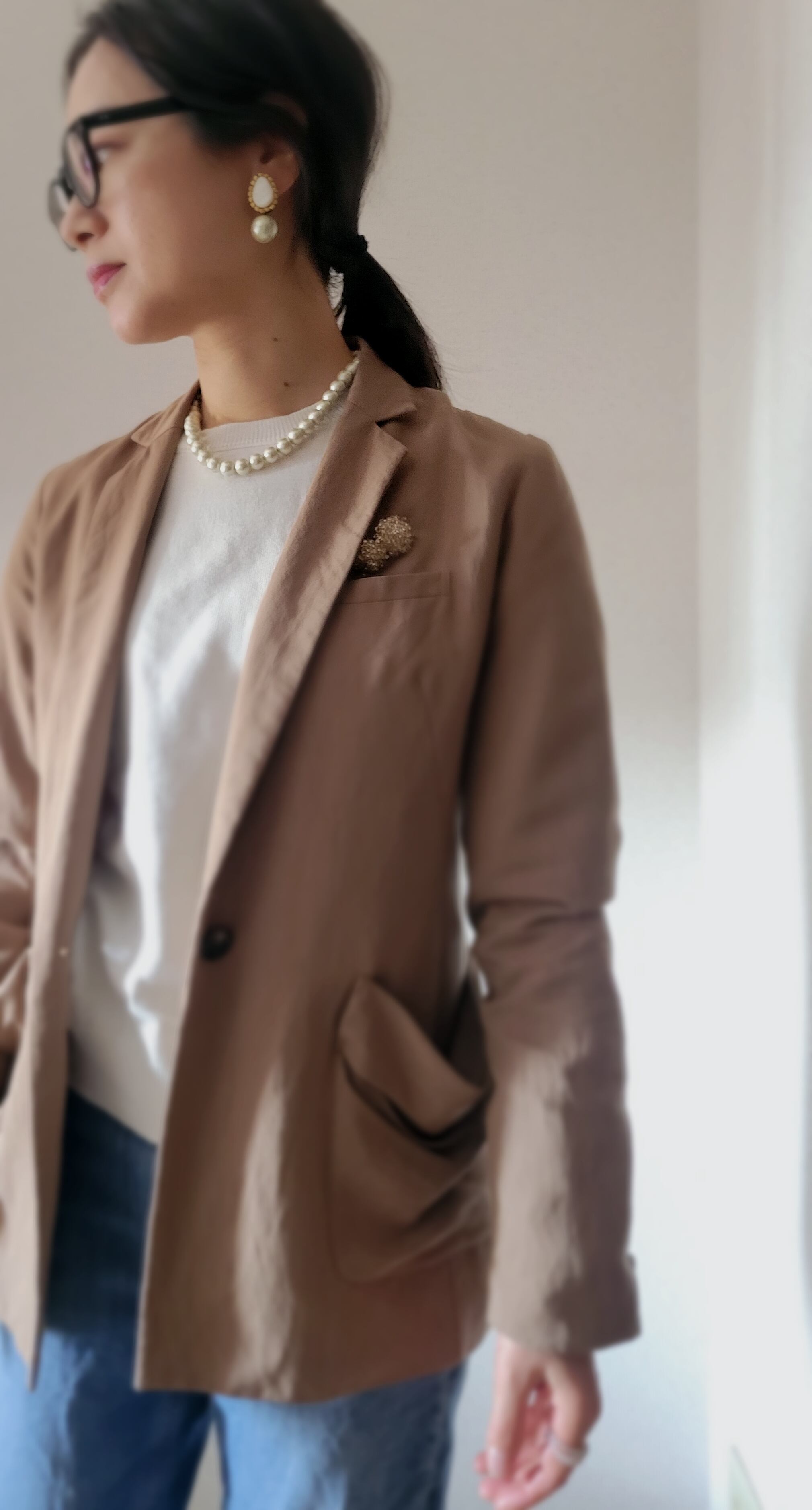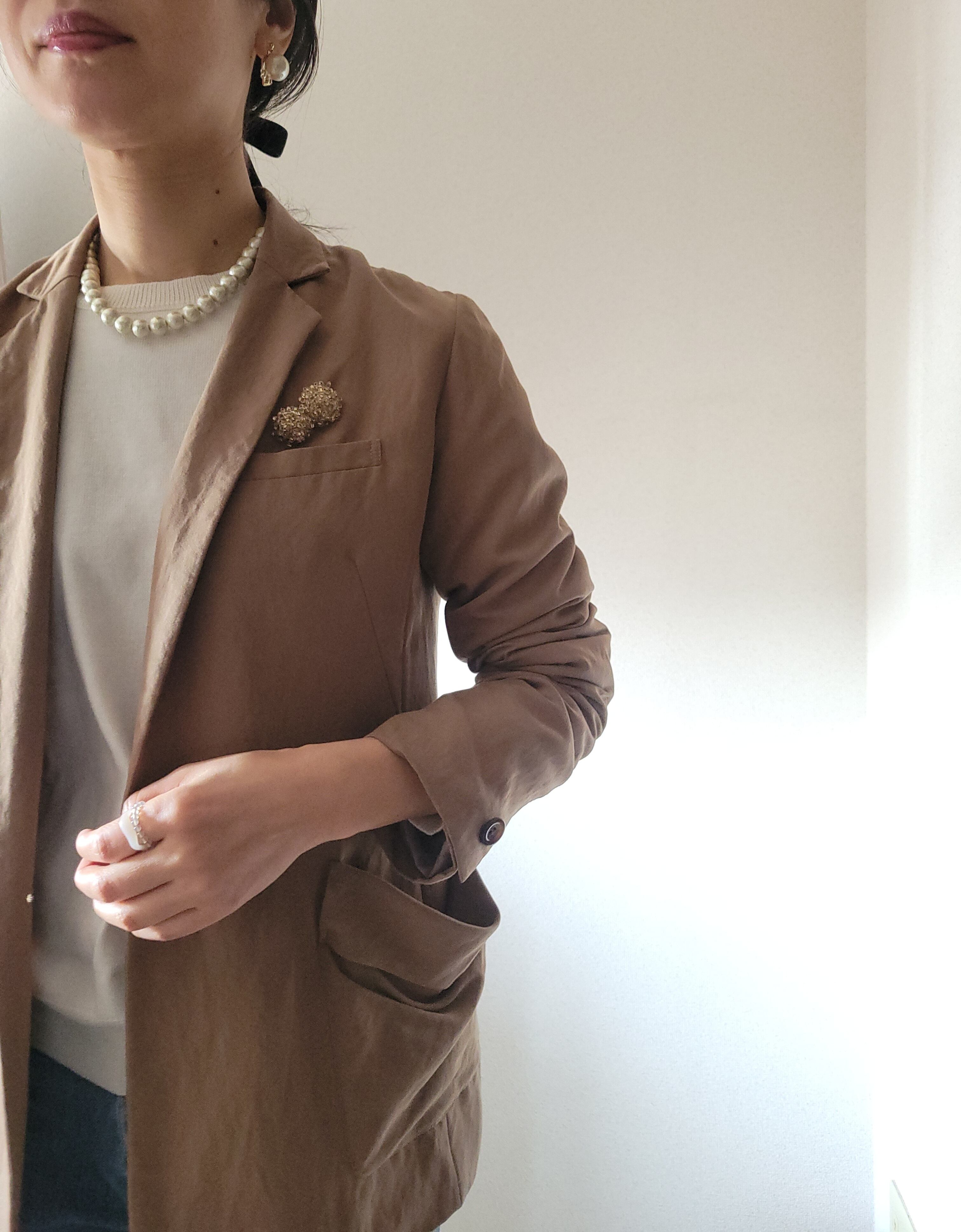 ブローチ初心者さんでも合わせやすいデザインと大きさ。
